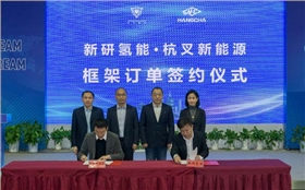 在新品發(fā)布后,杭叉新能源公司與新研氫能雙方簽訂了300臺燃料電池叉車框架采購協(xié)議,同時與新研氫能、翼迅創(chuàng)能三方共同簽訂了首批100臺燃料電池叉車采購訂單。